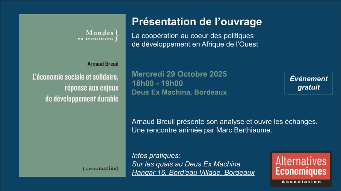 En marge du Forum mondial de lâESS de Bordeaux 2025 (qui est un Ă©vĂ©nement majeur de l'Ă©conomie sociale et solidaire, qui a lieu du 29 au 31 octobre 2025 Ă Bordeaux), lâAssociation des lecteurs d'Alternatives Economiques de Bordeaux organise le mercredi 29 octobre une prĂ©sentation du livre dâArnaud Breuil L'Ă©conomie sociale et solidaire au service du dĂ©veloppement durable.