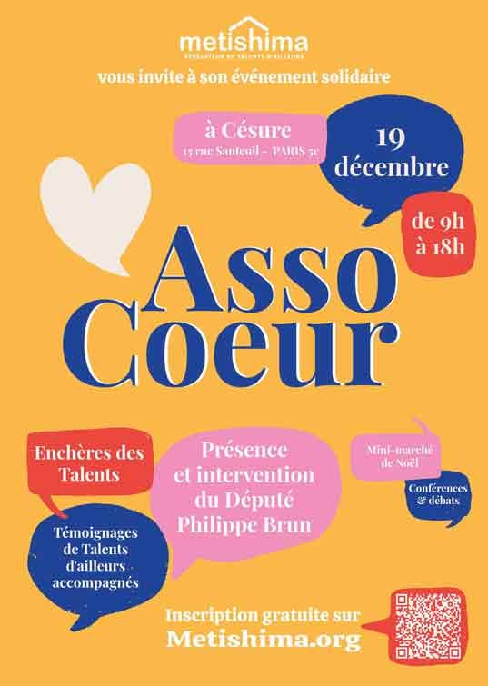 Asso Cœur est un événement solidaire organisé par l’association Metishima qui œuvre pour l’insertion socio-professionnelle des personnes exilées par la valorisation de leurs compétences