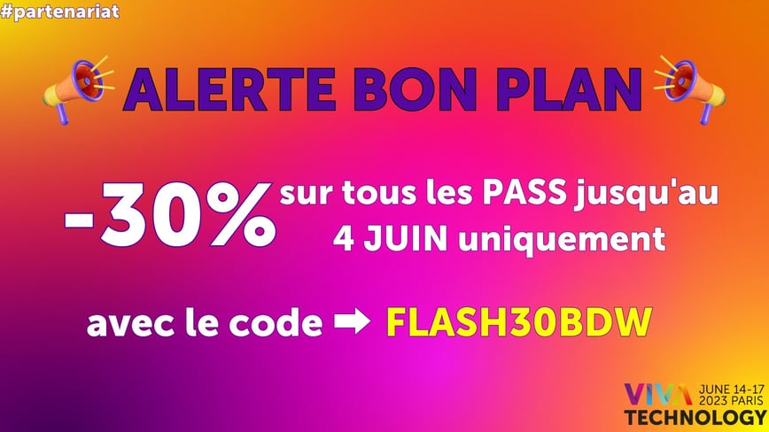 🔥 Dermière minute avant de partir : Vente flash jusqu’au dimanche 4 juin (donc dépêches toi il ne te reste plus beaucoup de temps). Tu peux bénéficier d’une réduction de 30% pour ton pass #VivaTech… Clique ici et utilise le code FLASH30BDW !🔥