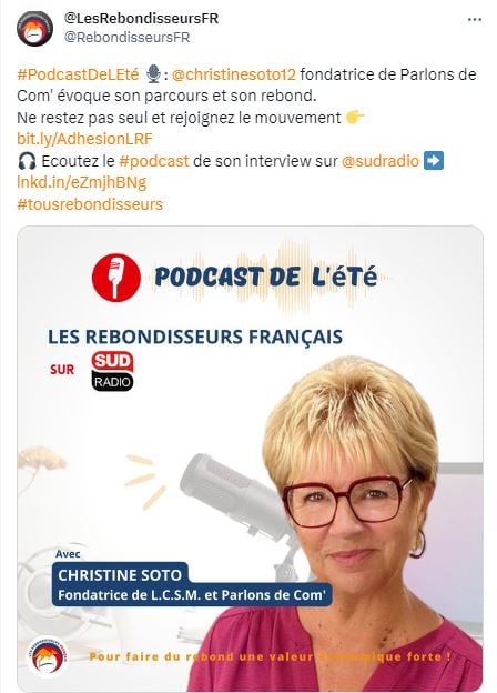 Et pour finir avec ces podcasts de lâĂ©tĂ©, je te conseille de dĂ©couvrir lâinterview de mon amie (et collĂšgue de La Brigade du Web) Christine Soto pour La chronique des Rebondisseurs Français de Sud Radio. Retrouve Christine Soto, ârebondisseuseâ, dans cet extrait de lâĂ©mission « les Vraies Voix » avec CĂ©cile de MĂ©nibus et Philippe David.