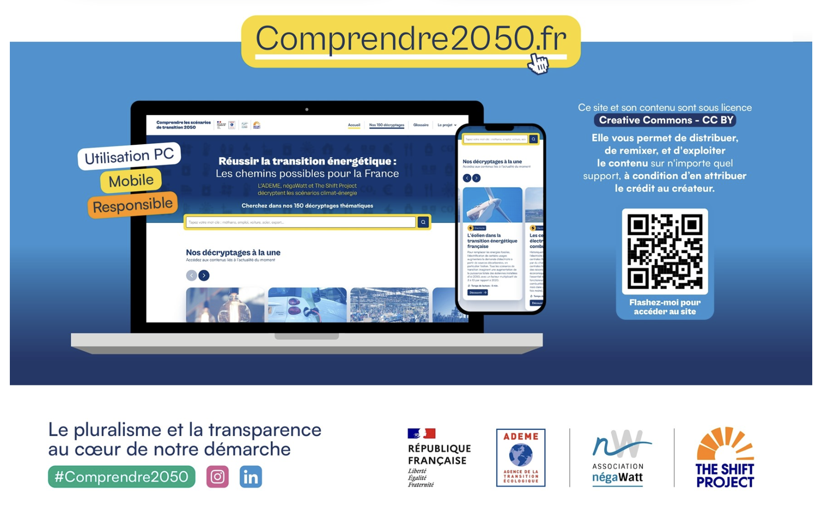 A lâaide de 150 chemins possibles, 23 grandes thĂ©matiques et un glossaire de 160 mots et expressions, Comprendre2050.fr est un site initiĂ© et portĂ© par lâADEME, NĂ©gaWatt et The Shift Project qui dĂ©crypte les diffĂ©rents scĂ©narios scientifiques de rĂ©fĂ©rence pour la France pour 2050.